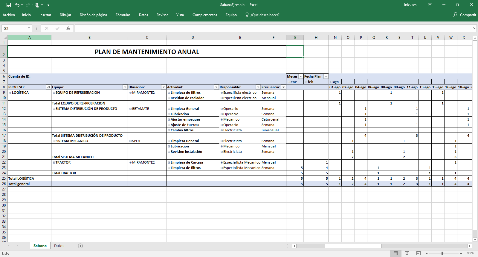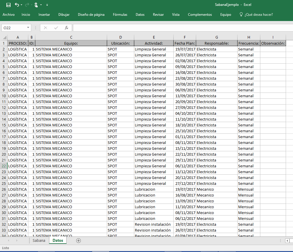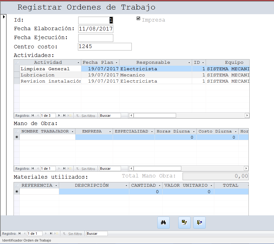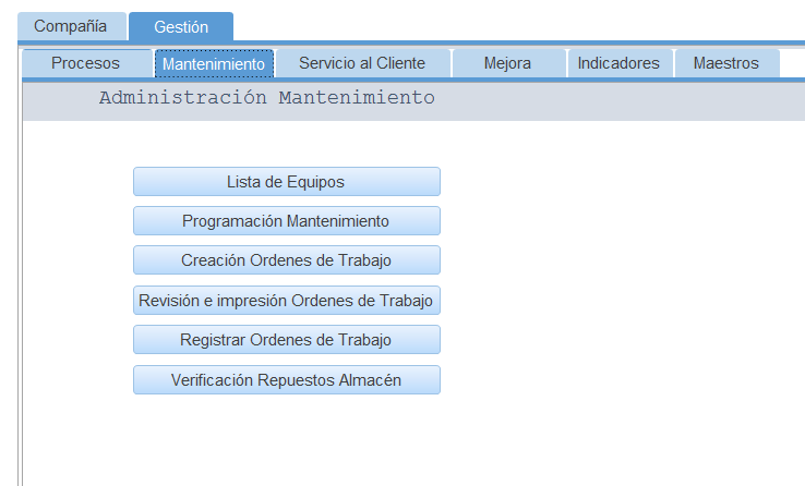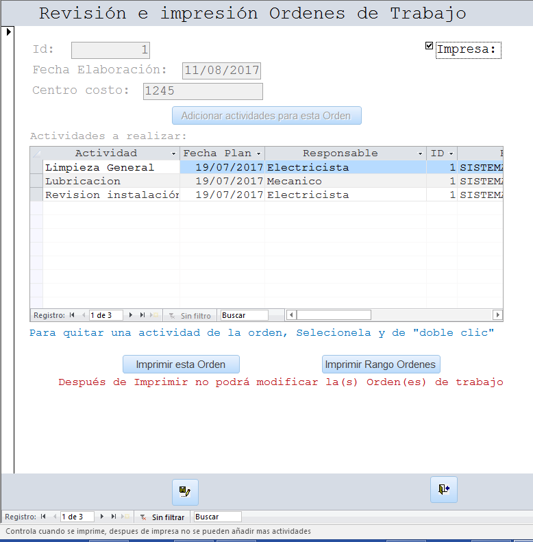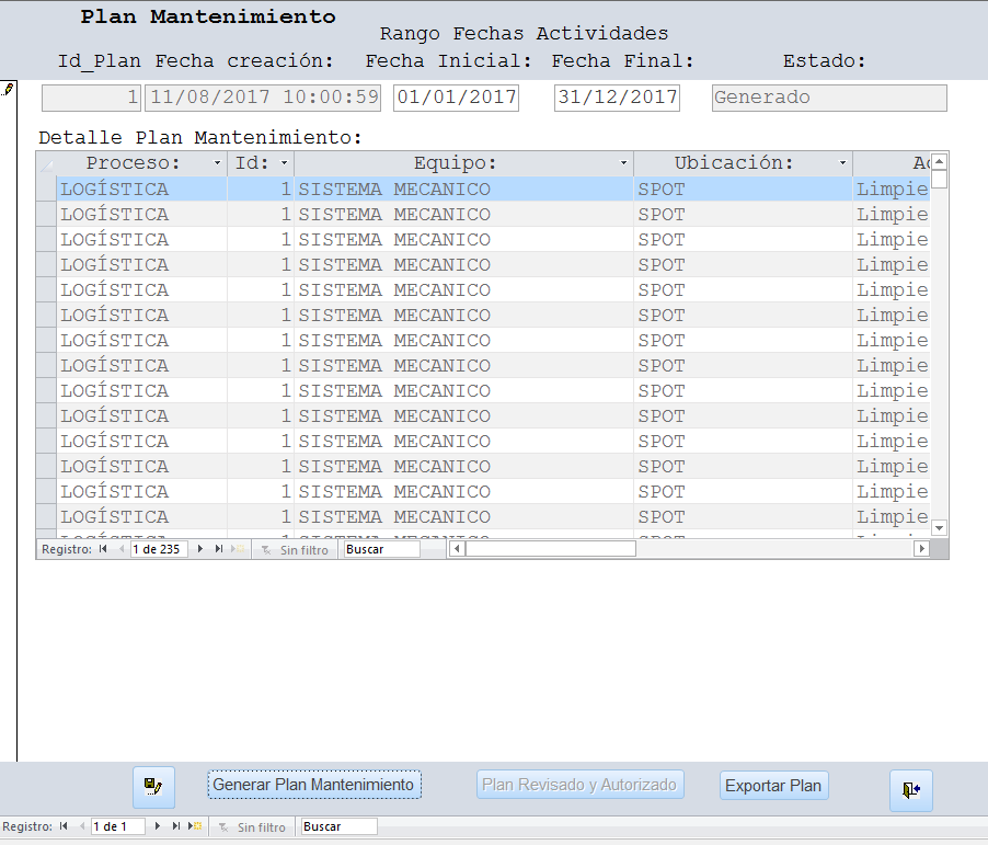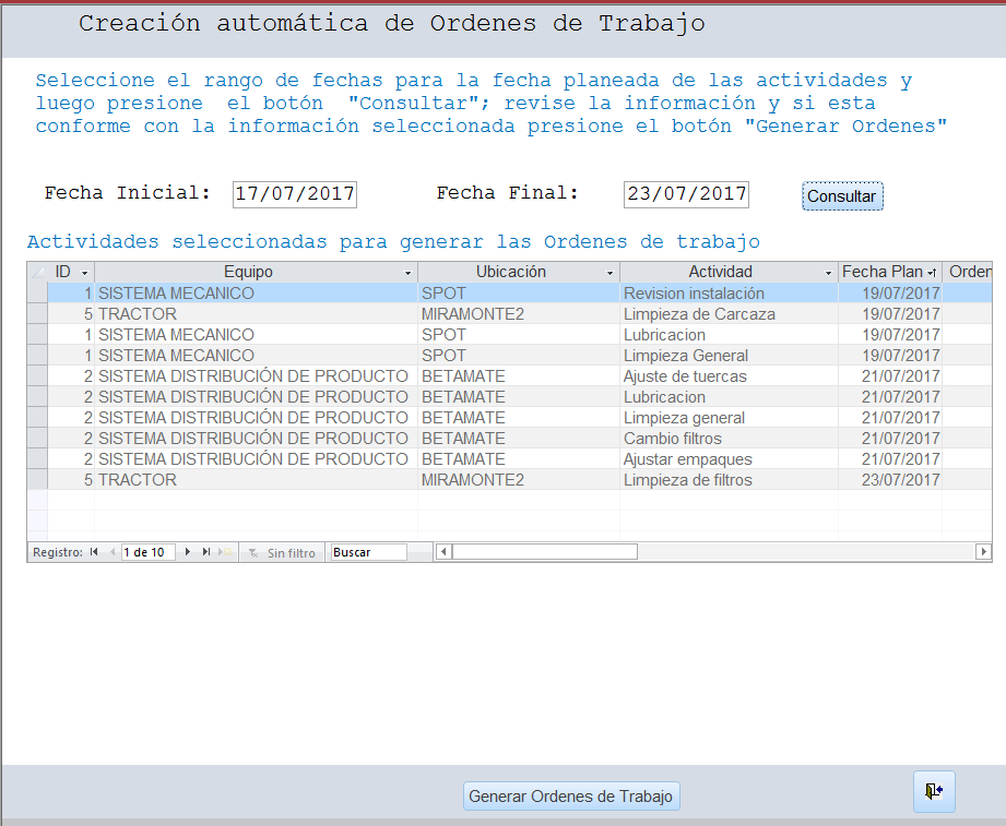 Se selecciona el rango de fechas para las fechas planeadas en el plan de mantenimiento, se selecciona la Fecha Inicial y la Fecha Final del rango, por lo regular el rango es semanal, luego se presiona el botón “Consultar”, el sistema muestra en la grilla central que actividades se encuentran en el rango seleccionado permitiendo que sean revisadas, si se está de acuerdo con esta información, se procede a presionar el botón “Generar Ordenes de Trabajo”, el sistema automáticamente genera las ordenes de trabajo para cada equipo respectivamente con las actividades que hayan sido escogidas, el sistema informa lo que ocurra.